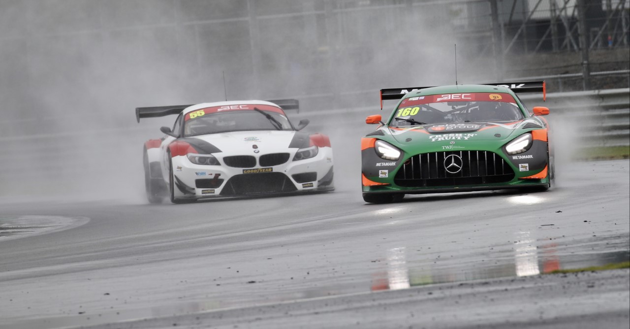 Wayne Marrs and Tom Jackson, in the Rob Boston Racing Mercedes GT3 took the win on the Silverstone GP circuit in atrocious conditions, finishing ahead of the similar Simpson-run machine of Hugo Cook and Sacha Kakad, who had impressively set a blistering pace in qualifying in their first-ever event in the car.