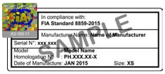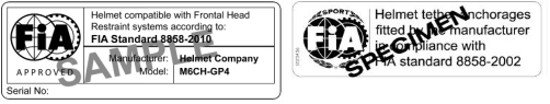 It is important to read the FIA label carefully to make sure it is one of the helmet standards as listed in NCR Ch.9 Art.7.1.a, as the earlier FIA helmet standard label, before the hologram system was introduced, is very similar in appearance to the early FIA 8858-2010 Standard label shown below (for non-8859/8860 helmets compatible with FHRs), this is not a helmet standard and requires an accompanying valid helmet standard, such as a Snell label. Take care not to confuse it also with the FIA 8858-2002 Standard label below, which relates to the FHR tether anchorages and again must be combined with a valid helmet standard.
