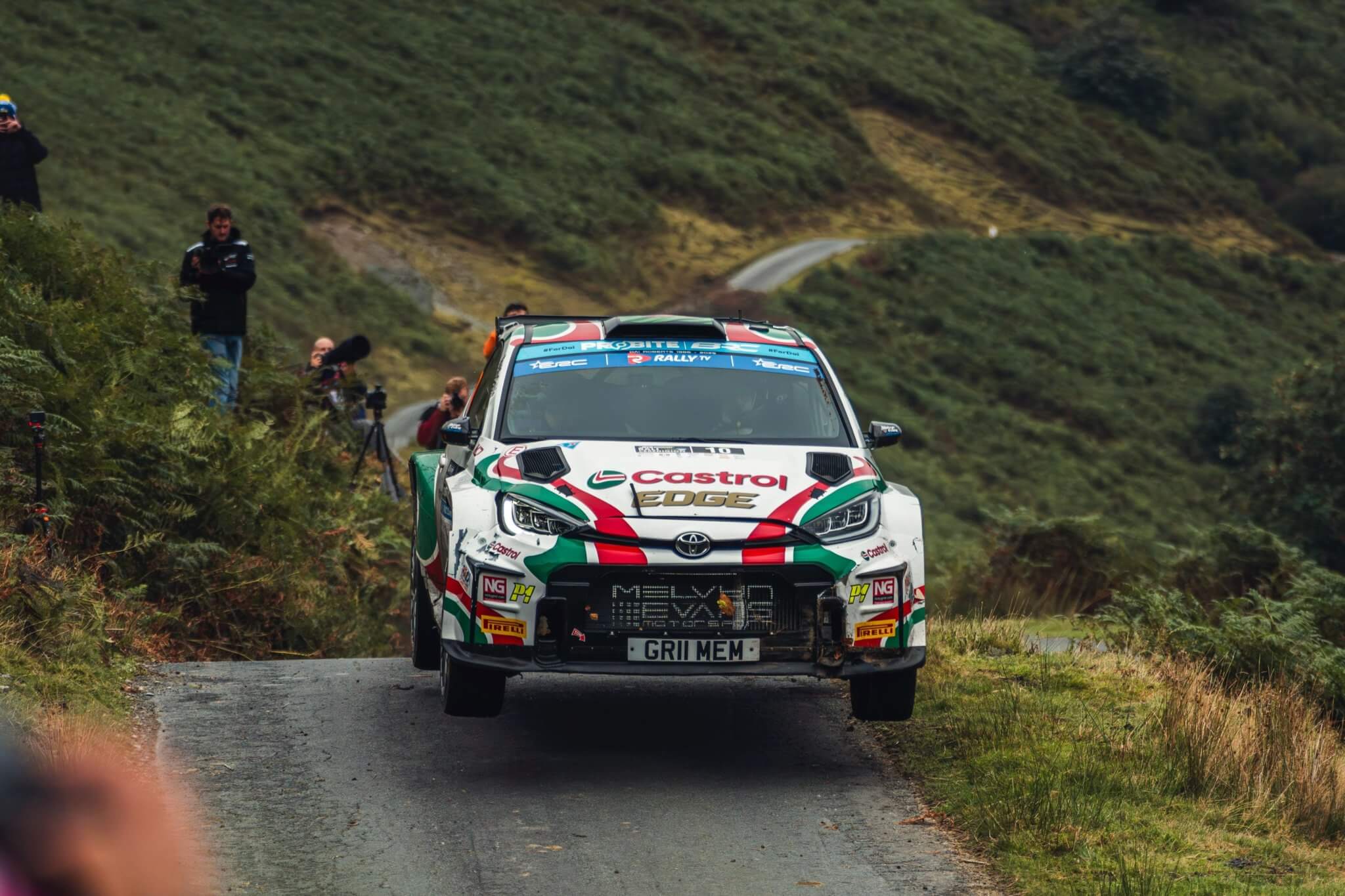 Local hero Meirion Evans’ push for the rally win ended with a spectacular visit to the scenery. Pulling his Yaris Rally2 out of the undergrowth, Evans limped on, now several minutes back from the leaders. Even rally leader Armstrong suffered a spin but thankfully it resulted in just a heart-racing moment and cosmetic damage rather than any substantial time loss.